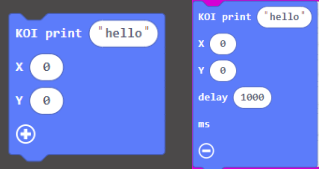 The print block shows a string at the specific coordinates. It shows the text for 1 second by default, this duration can be changed via delay.