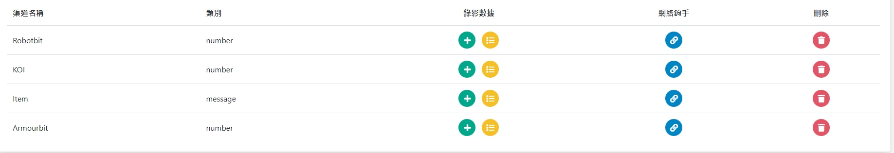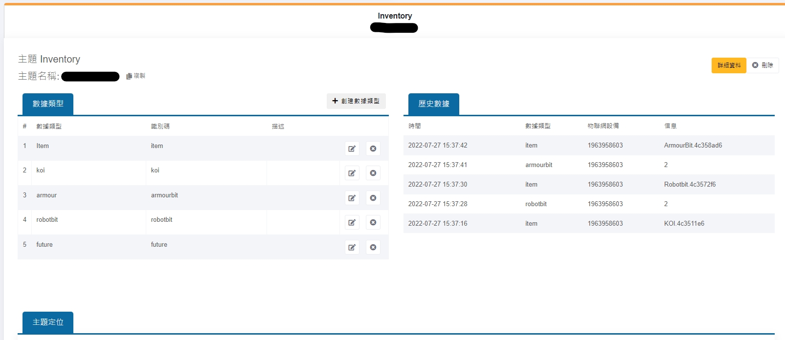 Create a new MQTT topic on MakerCloud and create data types: item, koi, robotbit, armourbit. (Reference)