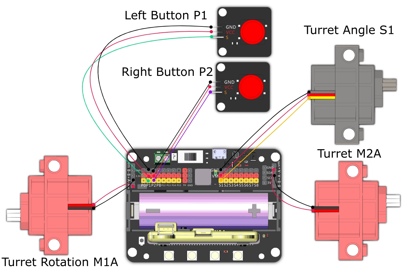 A robot capable of long-range artillery, aim and shoot the rubberband to knock the opponents.