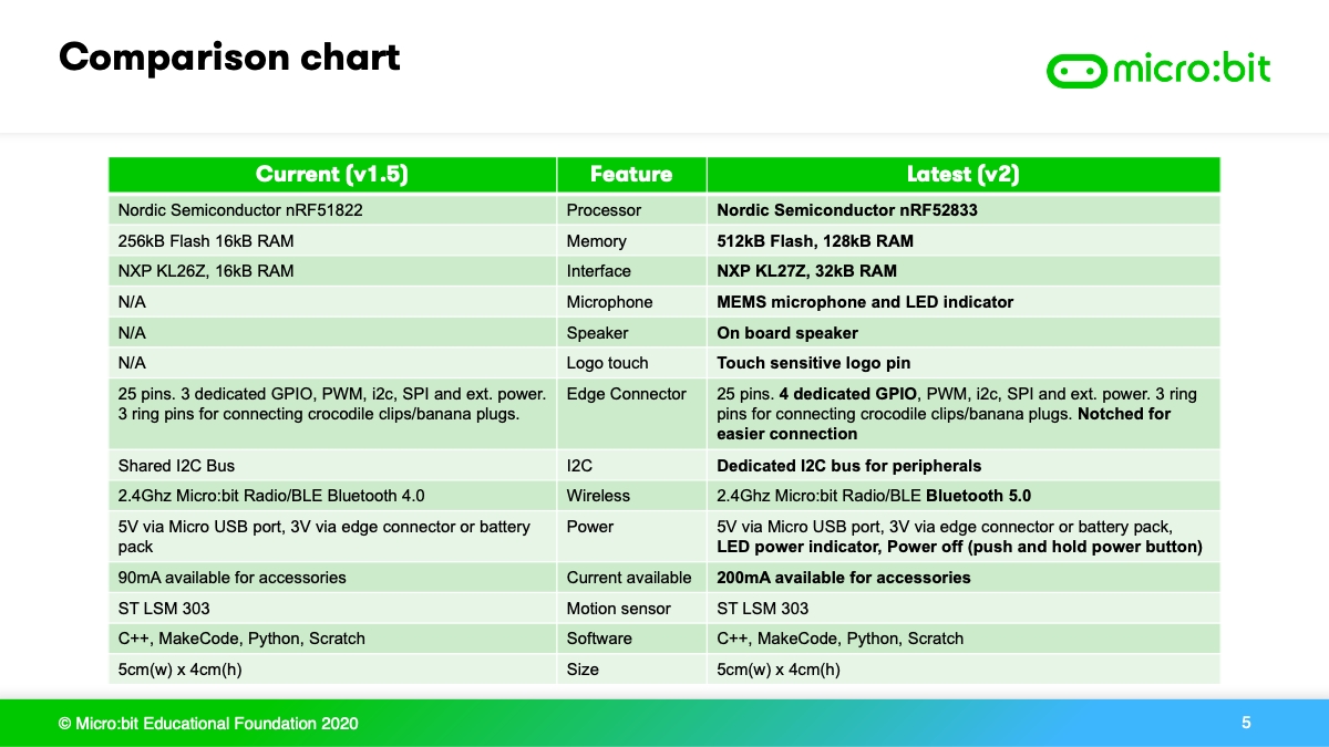 In preparation of future functions such as Artificial Intelligence and Machine Learning, the new Micro:bit has a new microchip that has vastly improved processing capabilities. The memory capacity is 8 times of the original, it now has 128Kb of RAM. The ROM has also been increased to 512 KB, allowing more complex and longer programs to be uploaded to the Micro:bit. Connectivity has also been upgraded to support the latest Bluetooth 5.0.